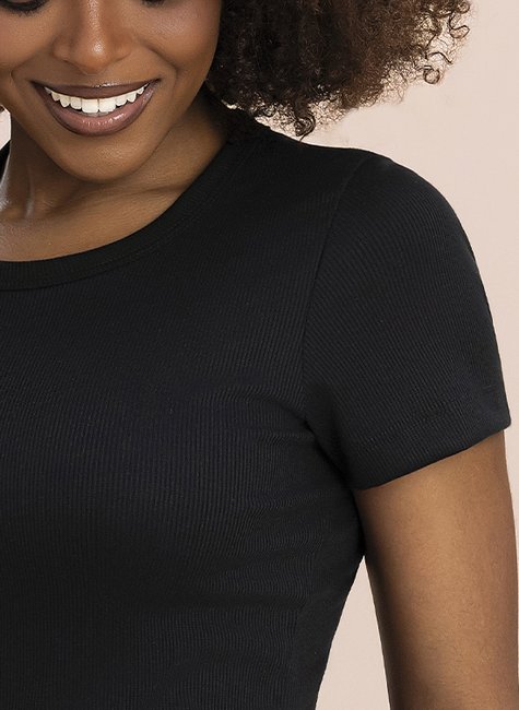 A Blusa Manga Curta Decote Careca Ribana Canelada Preta Essenciais da Lua Encantada é a peça básica indispensável no closet da mulher moderna e versátil.