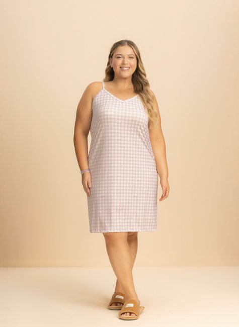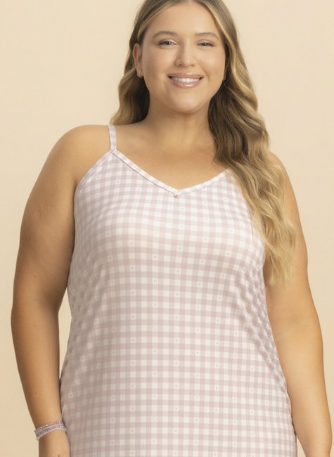Camisola de alça regulável da família Estelar que une o charme do xadrez ao sutil das estrelas, proporcionando delicadeza e sofisticação. Possui decote em V com pingente, adicionando um toque encantador e elegante para noites leves e cheias de conforto.