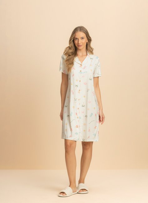 Camisola da coleção Família Clube L.E. que traz todo o charme dos dias de praia: em tecido branco, leve e refrescante, com estampas que evocam elementos tropicais. Possui manga curta e abertura frontal com botões, para facilitar o vestir e proporcionar estilo casual. Modelagem ampla, conforto relaxado, ideal para noites quentes ou para o descanso em casa com muito estilo.