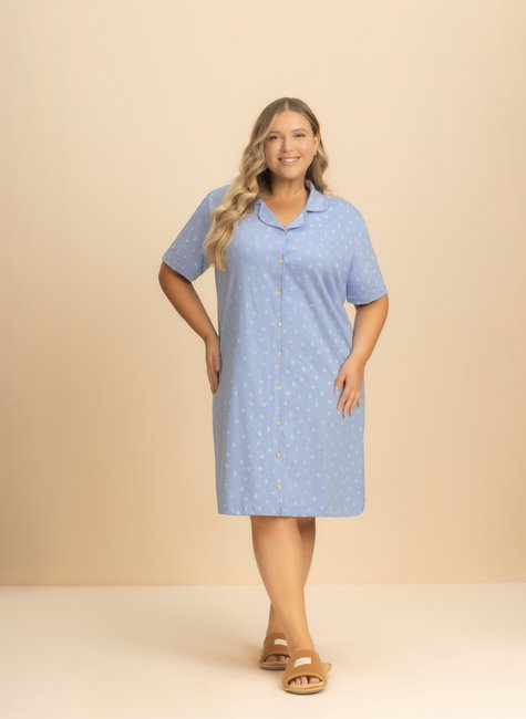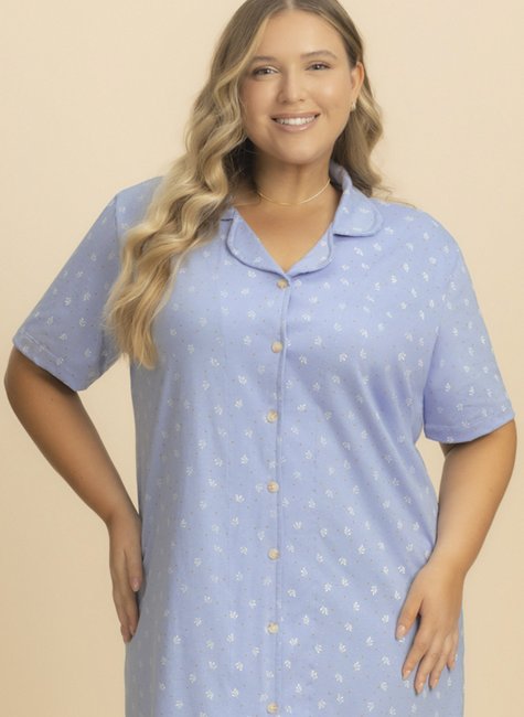 Seu tom azul suave com estampa de folhagens brancas traz um ar romântico e sereno, enquanto a abertura frontal com botões e a gola clássica adicionam praticidade e um toque elegante.