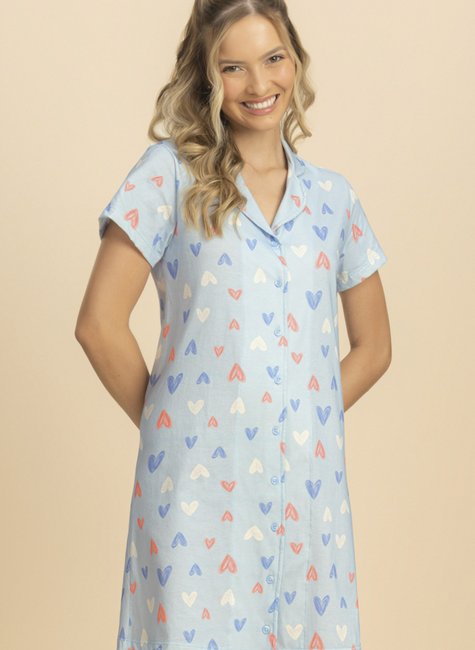 Essa camisola foi criada para quem valoriza conforto sem abrir mão de estilo. Com estampa inspirada nos detalhes de um passaporte, corações delicados e fundo azul suave, ela transmite a tranquilidade ideal para as noites de descanso.