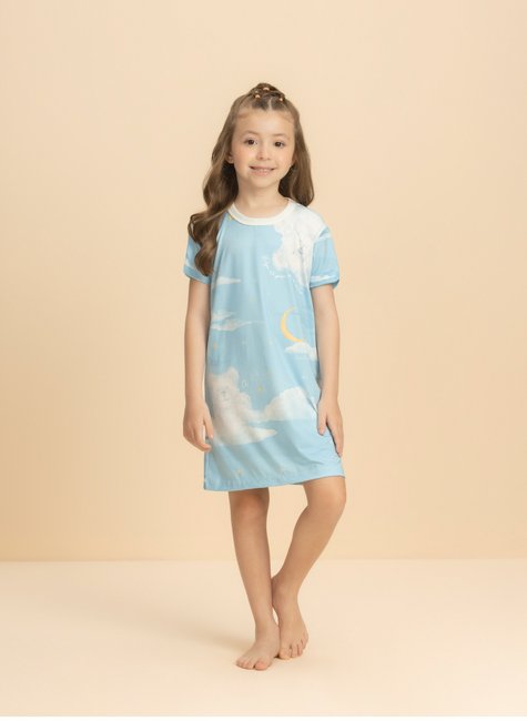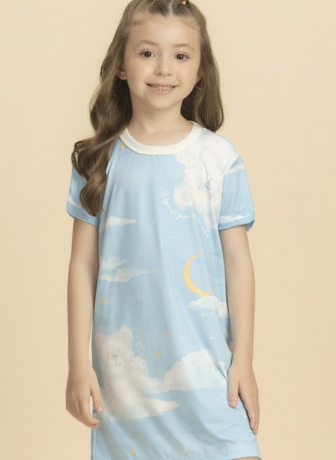 A camisola de manga curta traz uma estampa encantadora que remete ao céu azul com nuvens formando ursinhos, acompanhada da doce frase “Diga olá para os seus sonhos”. O toque final fica por conta de uma linda lua em tom dourado, que ilumina a peça com charme e delicadeza.