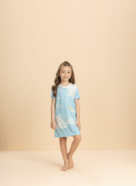 A camisola de manga curta traz uma estampa encantadora que remete ao céu azul com nuvens formando ursinhos, acompanhada da doce frase “Diga olá para os seus sonhos”. O toque final fica por conta de uma linda lua em tom dourado, que ilumina a peça com charme e delicadeza.