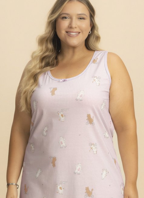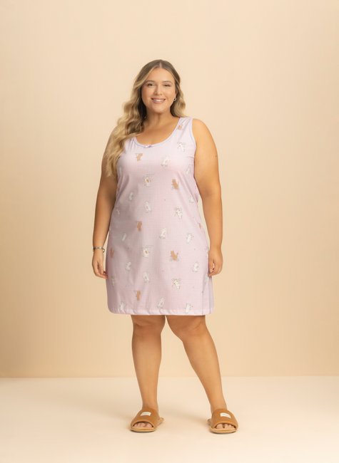 Camisola regata da família Passeando, confeccionada em 100% algodão para proporcionar maciez e conforto. Em tons suaves de lilás, traz bichinhos encantadores que deixam a peça ainda mais fofa. Possui decote redondo com um delicado lacinho lilás, adicionando um toque de charme e ternura ao visual.