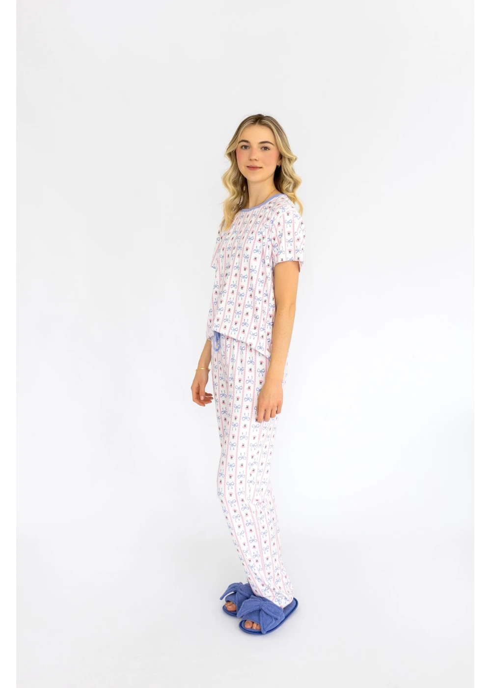 Pijama calça com manga curta, da nossa estampa de laço em collab com LiliBowtique, malha peach, super confortável e muito fofo