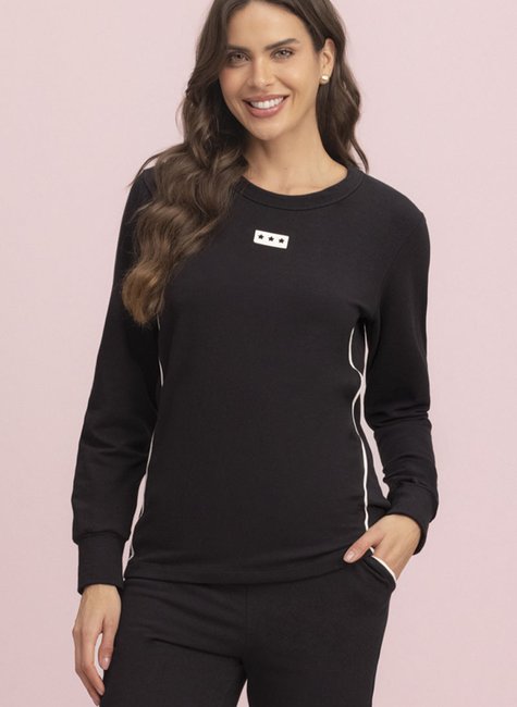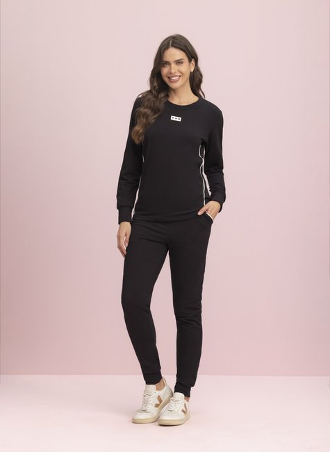 A linha Essenciais é perfeita para todas as noites e momentos, e por isso o nosso conjunto preto, veio para te dar estilo e sofisticação nessa estação de friozinho. Um modelo delicado e atemporal que te deixará elegante e estilosa sendo básica, a blusa possui filete na lateral e filete nos bolsos da calça, proporcionando um contraste entre a cor preto e branco. A peça também agrega punho na manga e na barra da calça e cós na cintura para proporcionar conforto. Outro detalhe lindo é a etiqueta vazada em formato de estrelas entregando charme. Conforto e estilo garantido.