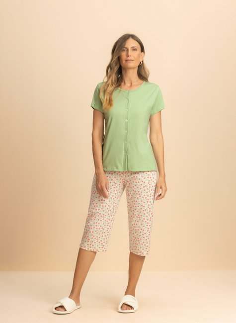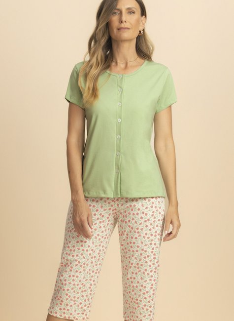 Pescador manga curta aberto com botões, da Família Doce Jardim, charme e delicadeza, confeccionado em 100% algodão. A camiseta verde combina com a bermuda estampada com flores que remetem ao jardim, resultando em um conjunto leve, confortável e cheio de encanto.