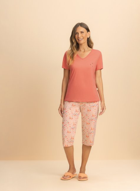 A camiseta em tom laranja alegre possui decote em V, trazendo leveza e delicadeza ao visual. Já a bermuda pescador, com comprimento abaixo do joelho, tem cós de elástico macio que garante aconchego e liberdade de movimento. O fundo claro com estampa de borboletas azuis e laranjas transmite suavidade, enquanto o aplique especial de três borboletas douradas na camiseta acrescenta um brilho mágico e cheio de charme.