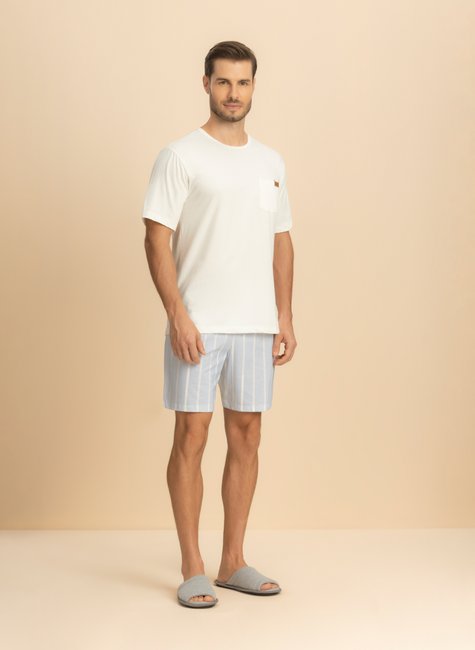 A bermuda azul clarinha com listras brancas, confeccionada em 100% algodão, garante frescor, maciez e liberdade de movimento, tornando o pijama ideal para momentos de relaxamento.