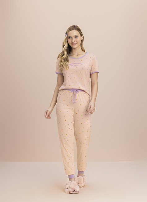 Ideal para a meia estação, o conjunto é composto por blusa de manga curta e calça comprida com punho, oferecendo ajuste confortável ao corpo sem abrir mão do estilo. A estampa clássica de poá colorido traz delicadeza e charme ao visual, enquanto o detalhe especial da ponteira de bolinha no falso amarrador adiciona um toque moderno e feminino à peça.
