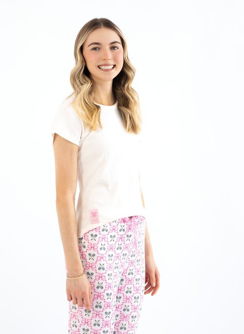 O pijama da coleção Tennis da Lua Encantada une o aconchego do algodão à delicadeza da estampa exclusiva. Acompanha blusa em ribana canelada lisa e calça 100% algodão, proporcionando um toque macio e leve. Perfeito para garantir noites de descanso com conforto e elegância, ele eleva seus momentos de relaxamento com charme e estilo.