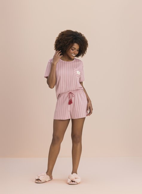 Na delicada cor rosa, o modelo ganha charme com listras discretas em vermelho, criando um visual clássico, moderno e atemporal. Rico em detalhes, conta com bolso funcional, etiqueta personalizada com a frase “leveza para todos os dias” e cordão no short com acabamento em tassel, que acrescenta um toque sofisticado à peça.