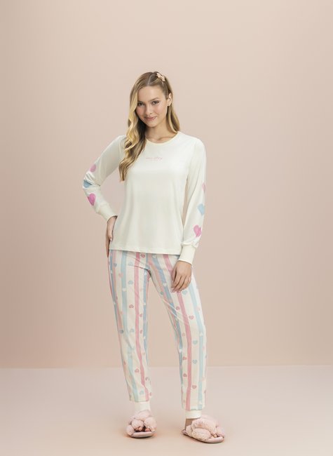 A camisa de manga longa lisa com estampa delicada traz um visual moderno e versátil, enquanto a calça estampada de coração adiciona charme e romantismo ao conjunto. A modelagem foi pensada para oferecer liberdade de movimentos e ajuste confortável ao corpo, tornando este conjunto pijama feminino confortável ideal para relaxar com estilo.