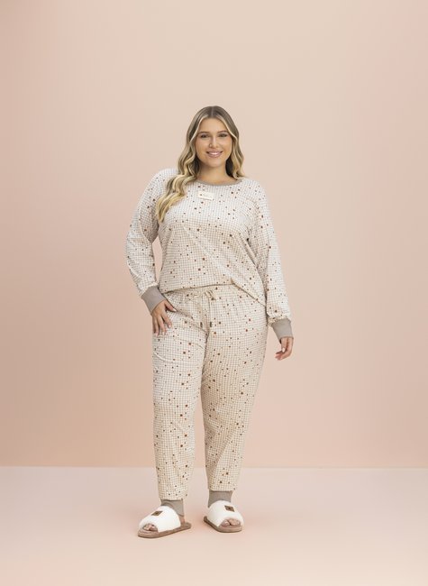 O modelo é rico em detalhes: possui punho nas mangas, gola em ribana que garante melhor ajuste ao corpo e calça com delicada estampa de estrelas em tons neutros, trazendo charme e sofisticação à peça. Ideal para quem ama um pijama feminino plus size confortável, estiloso e com acabamento premium.