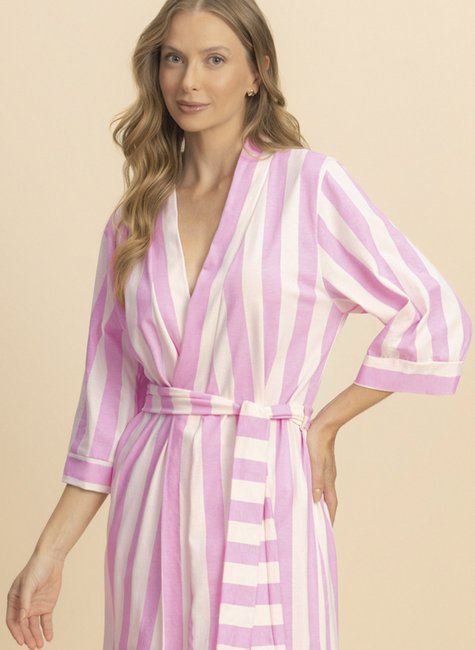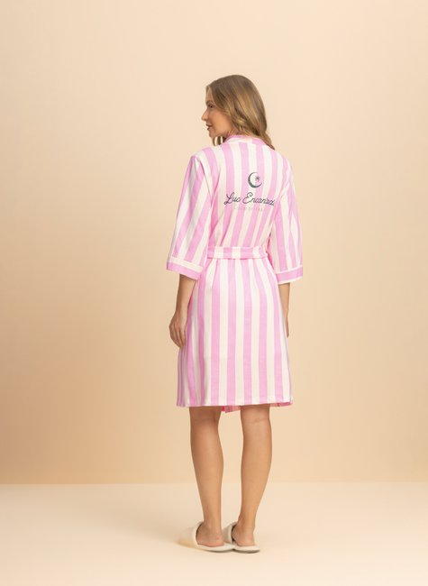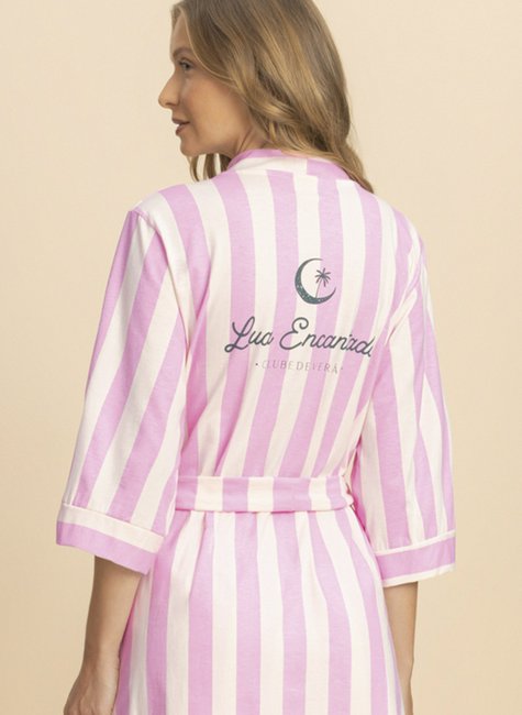 Inspirado no tema principal da estação, o robe Clube de Verão é um convite ao relaxamento, seja na praia, na piscina, no resort ou no conforto da sua casa. Com estampa listrada em branco e rosa, ele traz o frescor e a energia do verão em cada detalhe.