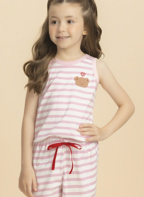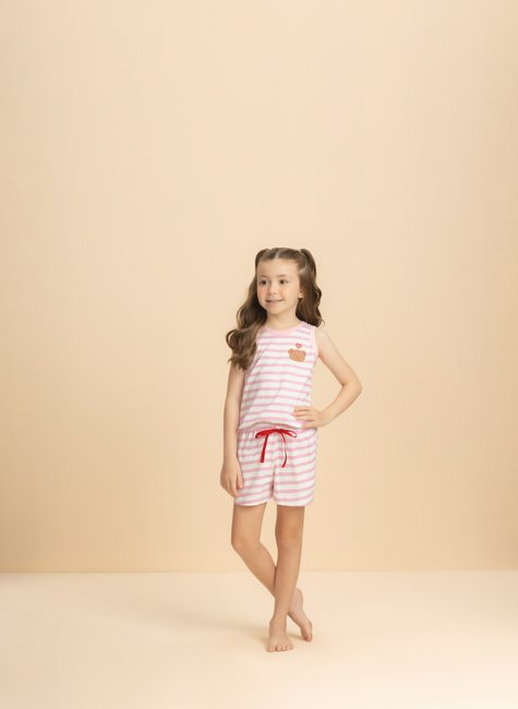 A estampa listrada em rosa suave traz um ar doce e moderno, enquanto o ursinho estampado na regata adiciona um toque lúdico irresistível. A cordinha decorativa no cós da bermuda finaliza o conjunto com charme e graça.